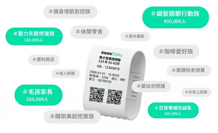 每月更新 1億筆以上發票數據,針對消費大檔、特定族群提供主題受眾,協助品牌開發更多高度相關、高含金量潛在消費者。